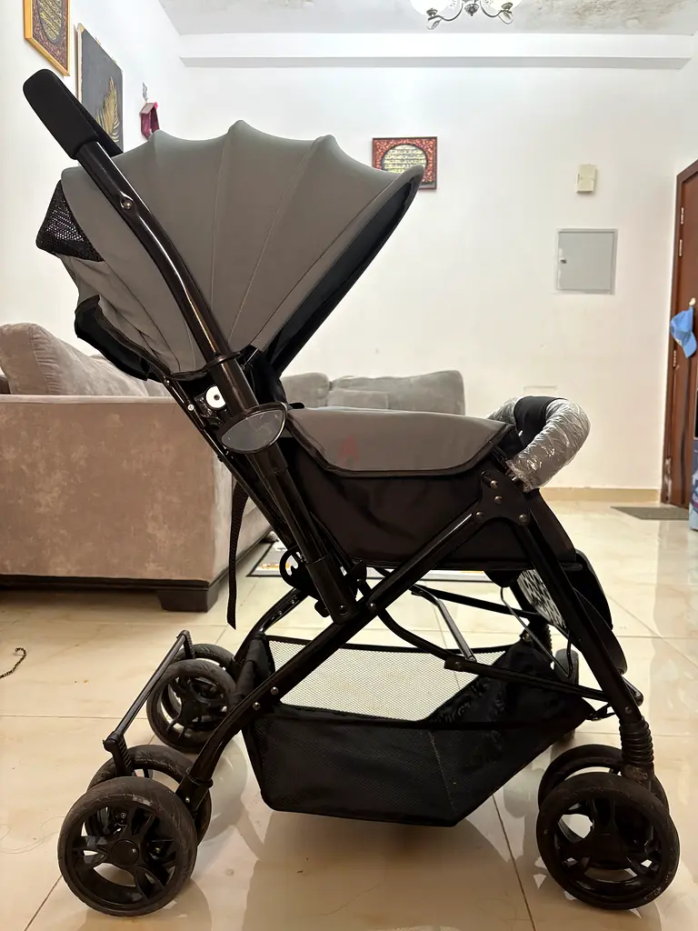 I'm selling a lightweight pram stroller that has been used only once and is in excellent condition. This stroller is perfect for little ones aged 1-4 years. It features a reversible seat, allowing you to change your child's view, and an extended canopy for added sun protection. The multiple recline positions ensure comfort whether they're awake or napping. The stroller also includes a handy storage basket for your essentials, making it a great choice for outings.