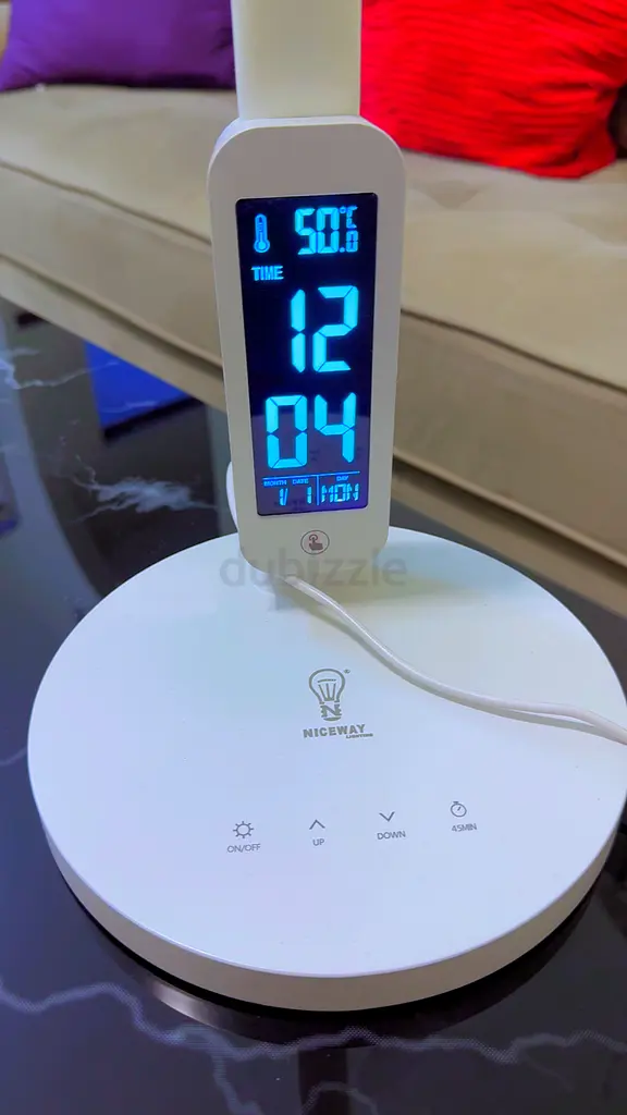 I'm selling a brand-new, never-used white desk lamp with an integrated digital clock, thermometer and touch controls. The lamp is flawless and comes without warranty. It has a clear blue LED display showing temperature, time and date, and touch buttons on the base for power, brightness levels, mode and alarm. The light has adjustable brightness and a flexible neck for positioning. Ideal for bedside or study use and ready to plug in and use.