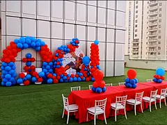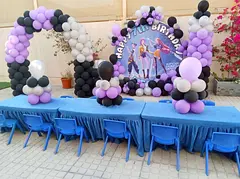 I’m planer your birthday party decorations and event setup kit used for children’s parties. This setup includes balloon arches, balloon columns, a themed backdrop panel, and table/seat arrangement for kids. Everything is in good condition and was use