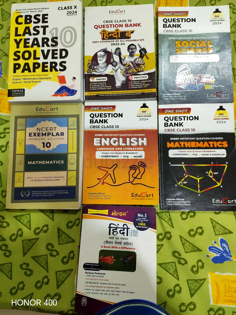 I am selling a complete set of CBSE Class 10 study materials, including the 'Last 10 Years Solved Papers & Question Banks'. These books are designed to help students prepare effectively for their exams. The set includes solved papers and comprehensive question banks for various subjects such as Mathematics, English, Hindi, and Social Science. All of these books are brand new and in flawless condition, as they have never been used.