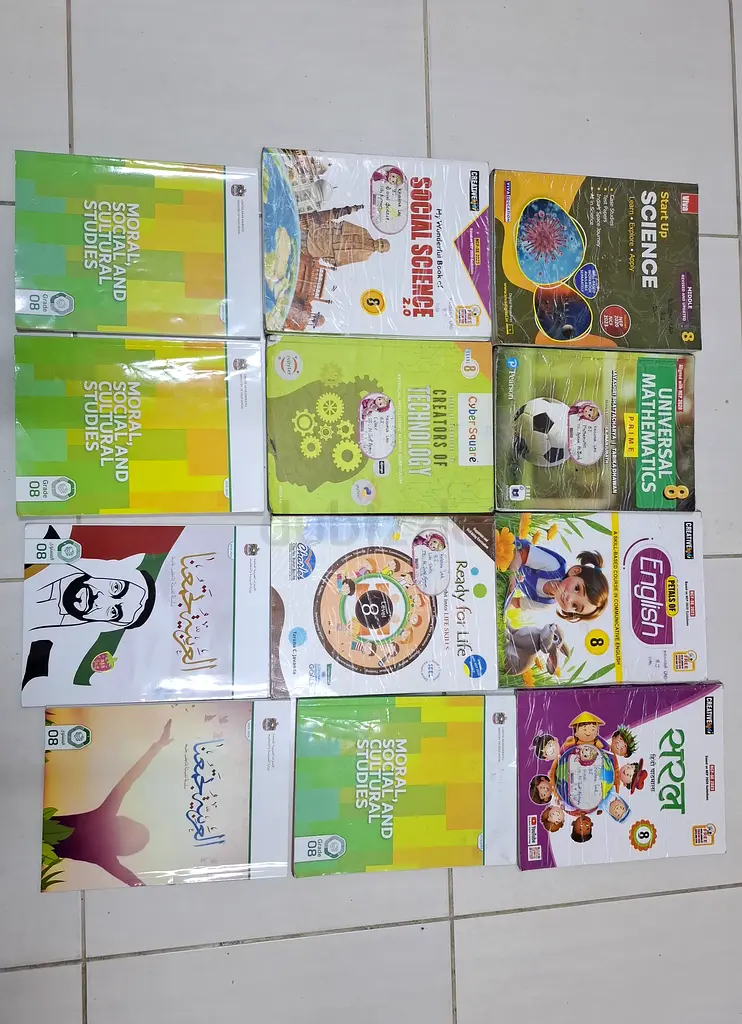 I'm selling a set of 12 Grade 8 school textbooks in paperback. It is for Habitat school or international indian school ajman.I used these for one school year (about 1–2 years old) and they are in good condition with normal signs of use — some light creases on covers and page corners, but all pages intact and readable. The set includes core subjects like English, Science, Mathematics, Social Studies, Islamiyat, Moral & Social Studies and additional workbooks and activity books as shown in the photos. These are suitable for a student currently in Grade 8 who needs a complete curriculum set for the year.