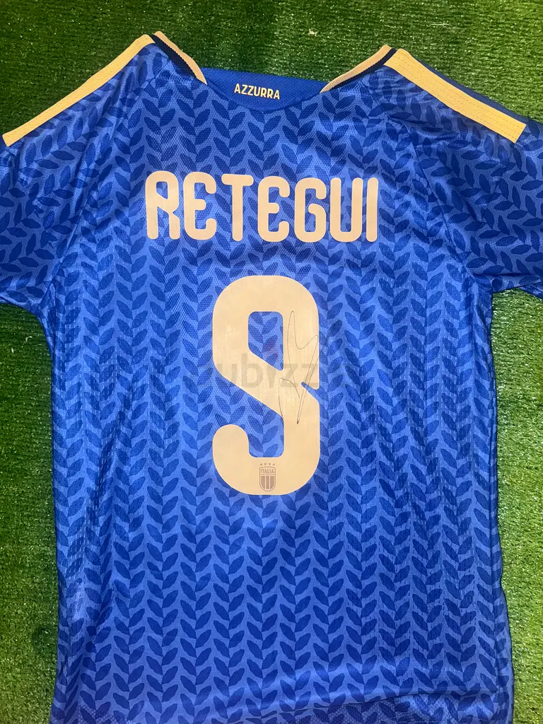 I'm selling an authentic Italy National Team jersey signed by the rising star, Retegui, wearing number 9. This jersey is in brand new condition and has never been used, making it a perfect collector's item or gift for any football fan. The vibrant blue color and unique design make it a standout piece. Whether you're watching the game or showcasing your team pride, this jersey is sure to impress.