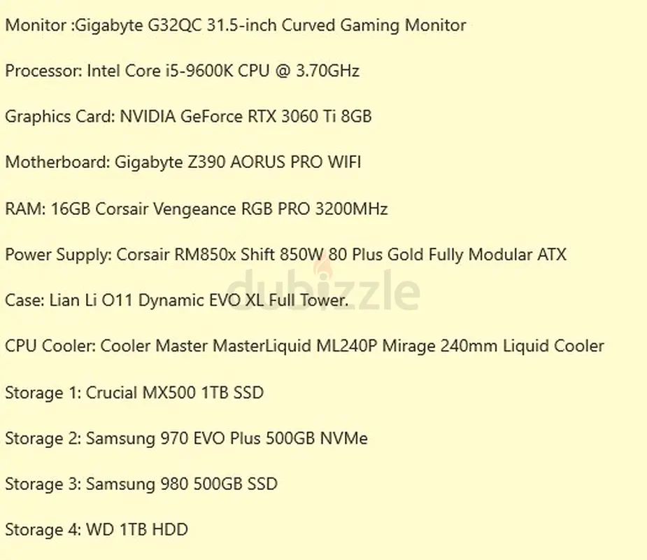 I’m selling my gaming desktop setup. I’ve used it normally for about 2–5 years and it’s in excellent condition. It runs on an Intel Core i5-9600K (3.70GHz) on a Gigabyte Z390 AORUS PRO WIFI motherboard, paired with an NVIDIA GeForce RTX 3060 Ti 8GB. RAM is 16GB Corsair Vengeance RGB PRO (3200MHz). Storage includes a Crucial MX500 1TB SSD, a Samsung 970 EVO Plus 500GB NVMe, a Samsung 980 500GB SSD, and a 1TB WD HDD—so total usable storage exceeds 2TB. The case is a Lian Li O11 Dynamic EVO XL full tower with a Cooler Master MasterLiquid ML240P Mirage 240mm AIO CPU cooler. Power comes from a Corsair RM850x Shift 850W 80 Plus Gold fully modular PSU. I’ve also used a Gigabyte G32QC 31.5-inch curved monitor with it (listed with the system). No warranty applies. It’s ready to use for gaming or content work and has been well maintained with normal usage. Product specifications: