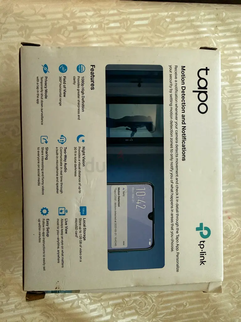 I'm selling my TP-Link Tapo Smart Security Camera, which I used only once. It's in good condition and has been well taken care of. This camera is perfect for keeping an eye on your home or office with its motion detection and notification features. You can easily manage everything through the Tapo App and even set specific detection zones.