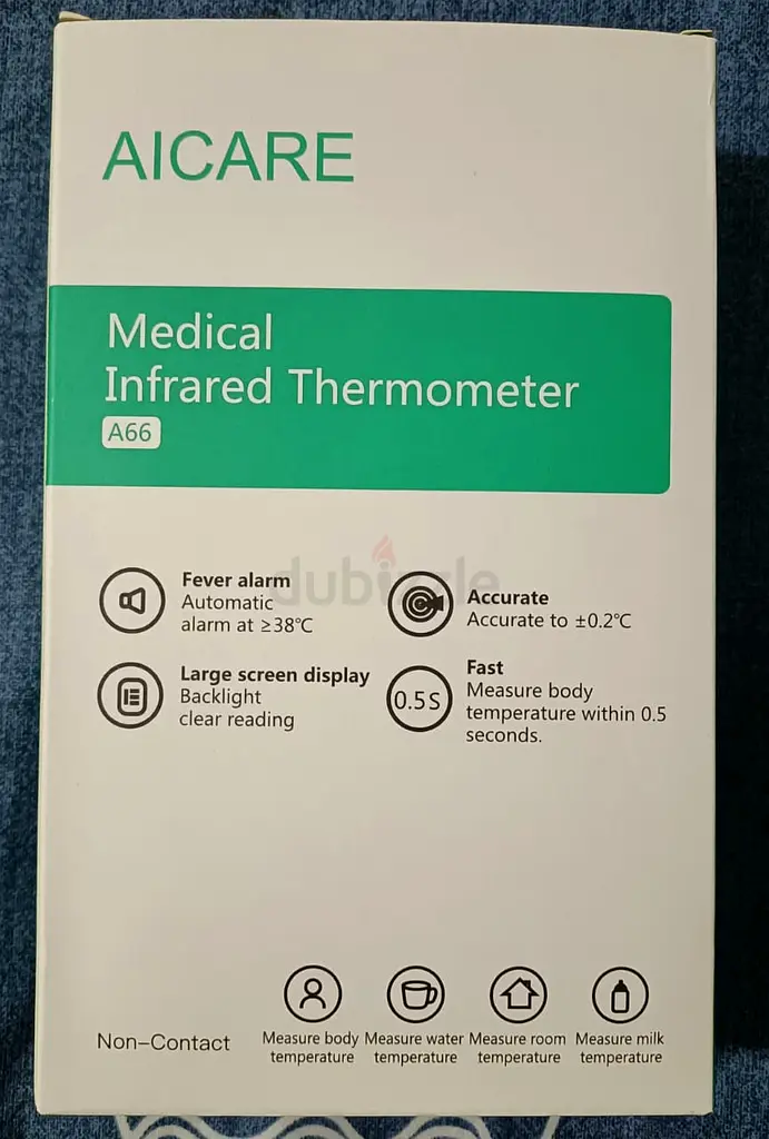 I'm selling my AICARE Medical Infrared Thermometer A66, which is brand new and in excellent condition. This thermometer is perfect for quick and accurate readings, making it an essential tool for every household, especially in these times. It features a large screen display with backlight for easy reading, and it can measure body temperature in just 0.5 seconds. It also has a fever alarm that automatically alerts you when the temperature is higher than 38°C. The device is designed for non-contact use, ensuring hygiene and safety.
