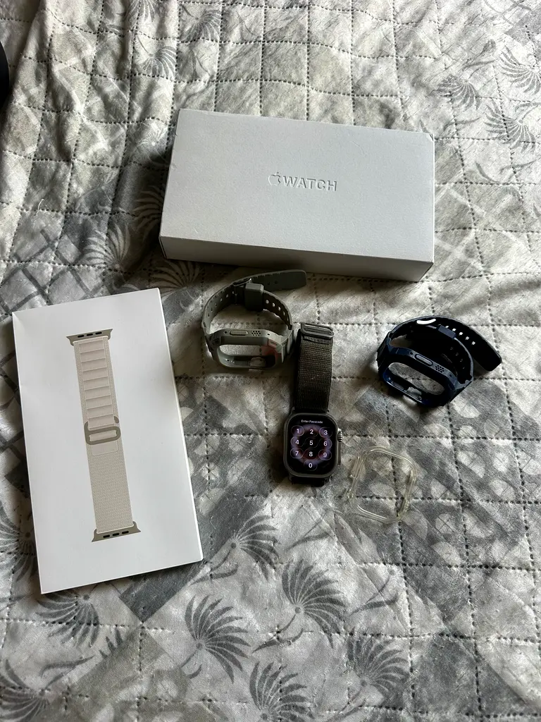 I'm selling my Apple Watch Ultra 1, which is about 1-2 years old. The watch has been used normally and is in excellent condition, showing minimal signs of wear. It comes with the original box and includes a couple of bands for versatility. Please note that there is no warranty left on it. This smartwatch offers a range of features for health tracking and connectivity.