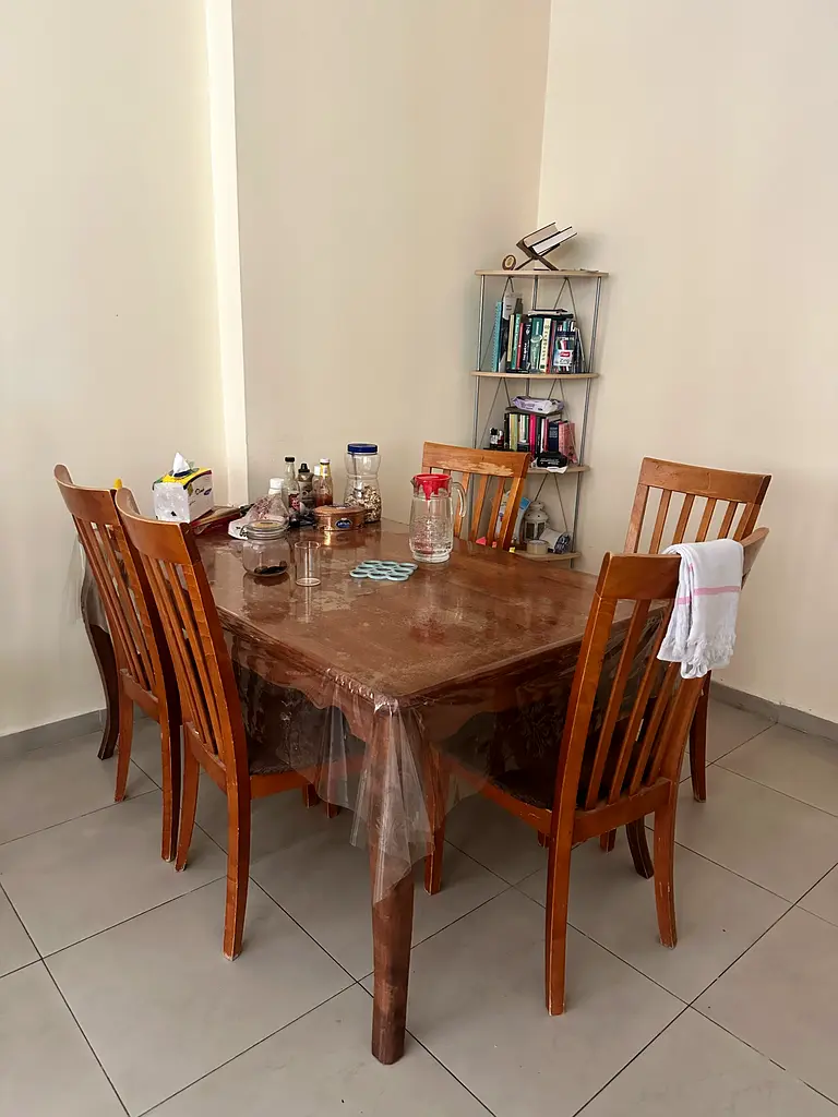 I'm selling a solid wooden dining table with chairs from Ikea. This set has been in normal usage for about 1-2 years and is in good condition. The table is rectangular and comfortably seats up to 6 people, making it perfect for family meals or gatherings. It features a warm brown color that adds a cozy touch to any dining area.
