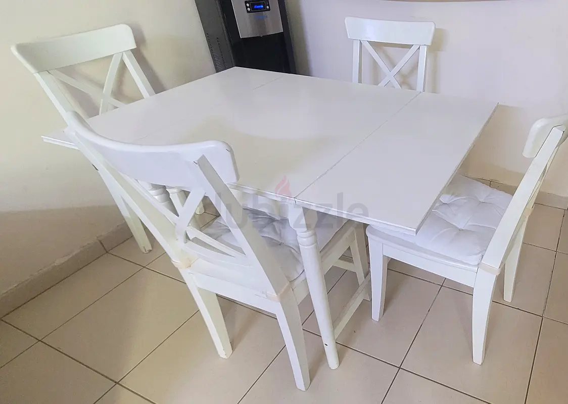 I’m selling my Pan Emirates white extendable dining table with four matching cross-back chairs. It’s about 1–2 years old and in excellent condition with light usage only. The table is rectangular and has an extendable leaf in the middle so it can be used compact or slightly larger when needed. The chairs have cushioned seats (white cushions) and solid wooden frames that match the table. There are no scratches, stains, or structural issues to note — well cared for and cleaned regularly. Ideal for a small family or apartment dining area.