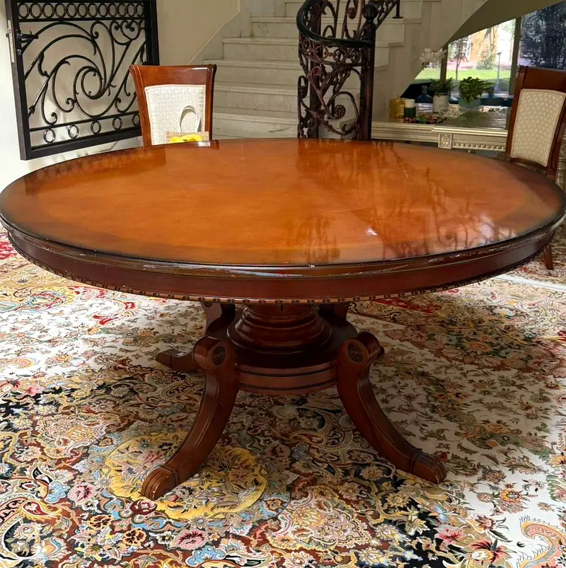 Beautiful large round dining table made from solid wood with a rich polished finish. Features a sturdy pedestal base with elegant carved details. Comes with 8 matching chairs with cushioned seats and decorative backs