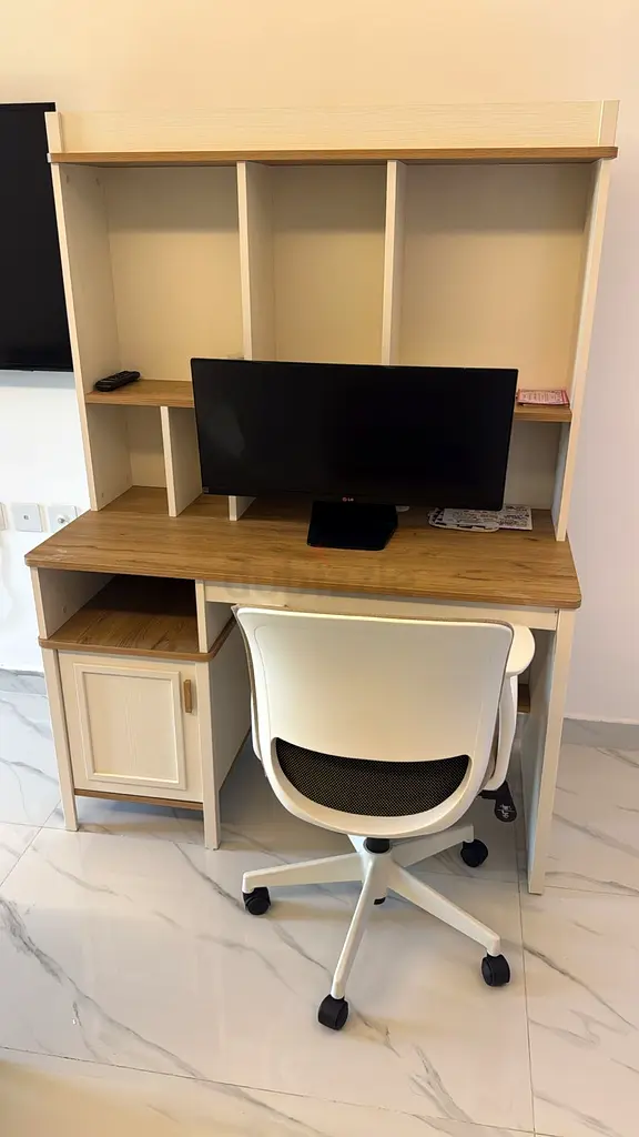 I'm selling my brand new stylish study table with a chair that is in flawless condition. This elegant white table features a spacious rectangular shape, perfect for any home office or study area. It includes built-in shelves that provide ample storage for books, stationery, or decorative items, making it a functional as well as attractive addition to your space. The chair is comfortable and complements the table beautifully. I have never used this set, and it still looks as good as new!