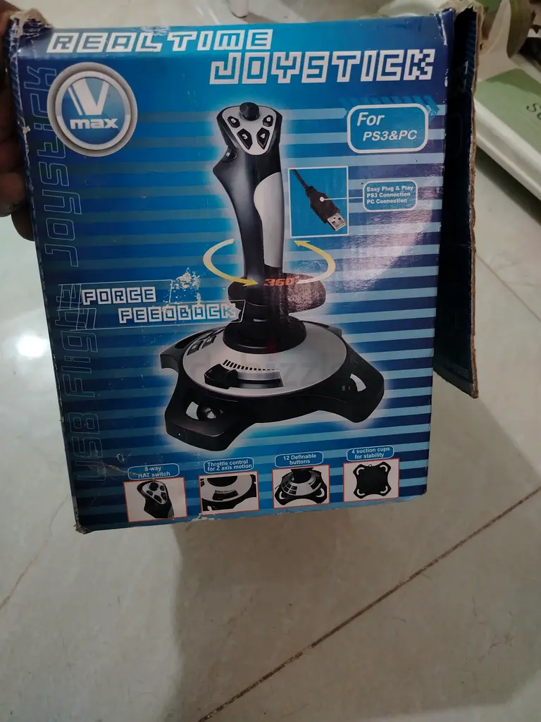 I'm selling my VMax Realtime USB Force Feedback Joystick (PS3 & PC). It's been with me for about 2–5 years, used lightly and in good condition. It connects via USB and offers force feedback as indicated on the box; it's plug-and-play for PC and marked compatible with PS3. I kept the original box and packaging. There are minor signs of use but no functional issues.