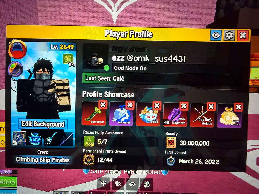 • Blox Fruits: باونتي 30 مليون | أكثر من 12 فاكهة دائمة (Perms) | رداء Dark Coat النادر وكل القيم باسات.
