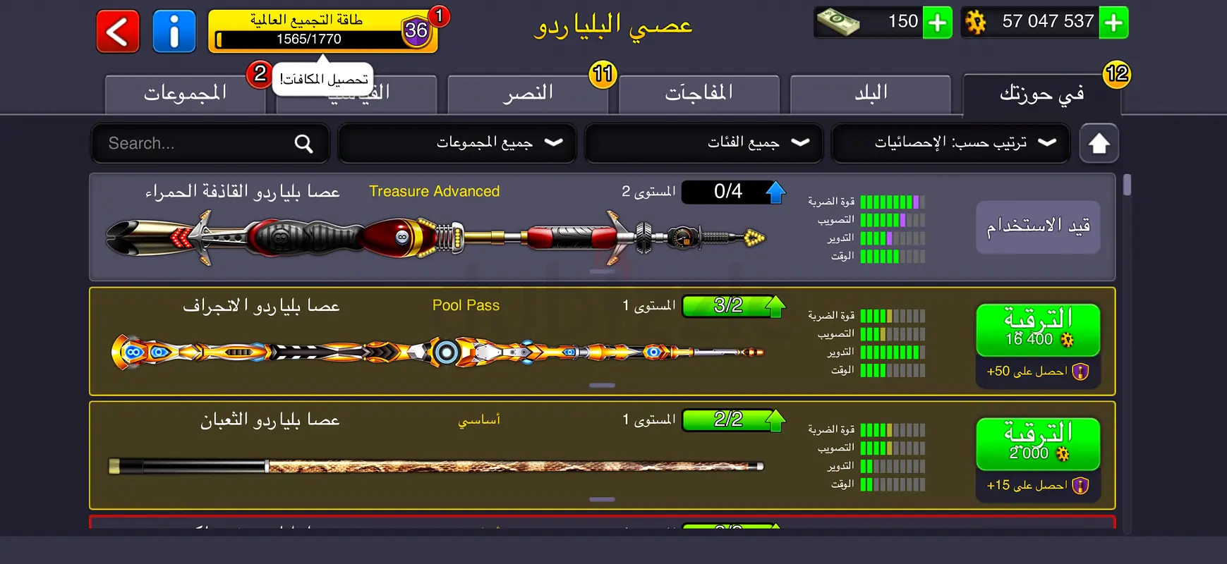 للبيع حساب 8 Ball Pool لقطة وشغل نظيف جداً يا شباب، الحساب متعوب عليه ومستواه قوي (Level 40)، والي يدور التميز والفوز بكل سهولة هذا الحساب المناسب: • الكوينز: فوق الـ 57 مليون كوينز (يعني العب في أكبر الطاولات وأنت مرتاح). • الكاش: متوفر فيه 150 كاش. • قوة التجميع (CCP): واصل لـ Level 36، يعني الإضافات والامتيازات عندك قوية. • العصي (Cues): الحساب مليان عصي نادرة ومطورة (Maxed & High Stats)، منها عصي الـ Pool Pass Premium وعصي الـ Treasure النادرة. • الصناديق: فيه صناديق في الانتظار جاهزة للفتح. ملاحظة: الحساب أساسي وطريقة النقل آمنة 100%.