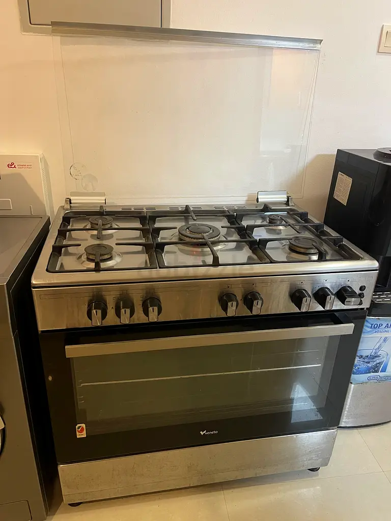 للبيع غاز 5 عيون نوعية ممتازة مع فرن داخلي تشغيل فوق وتحت في نفس الوقت مع وجود مروحة داخلية لتوزيع الحرارة الغاز يعمل بنظام المركزي او الاسطوانه الغاز بحالة ممتازة