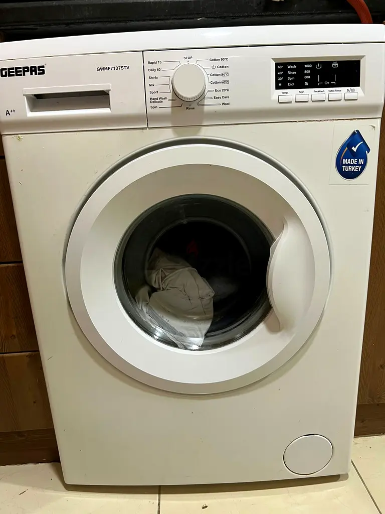 I am selling my Geepas Front Load Washing Machine. It's in good condition and has been used normally. This machine is perfect for families with children aged 2-5 years, as it's efficient and reliable for everyday laundry needs. It has a capacity of 7 kg, making it great for medium-sized loads. The washing machine is made in Turkey and doesn’t come with a warranty.