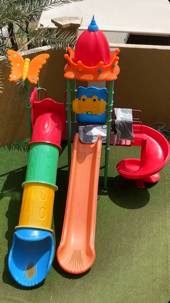 I’m selling a kids plastic playset with twin slides and a tunnel, in good condition. I bought this about 2–5 years ago and it’s been used normally by my kids. It includes two slides (one straight orange slide and one spiral red slide), a colorful tube tunnel (green/yellow/red/blue), a small climbing platform with a decorative crown top and butterfly detail, and a short ladder. The plastic has some minor scuffs and sun-fading consistent with normal outdoor use but no cracks affecting safety. All parts are intact and stable on flat ground. Easy to assemble and move — perfect for toddlers and young children for backyard play. Local pickup only.