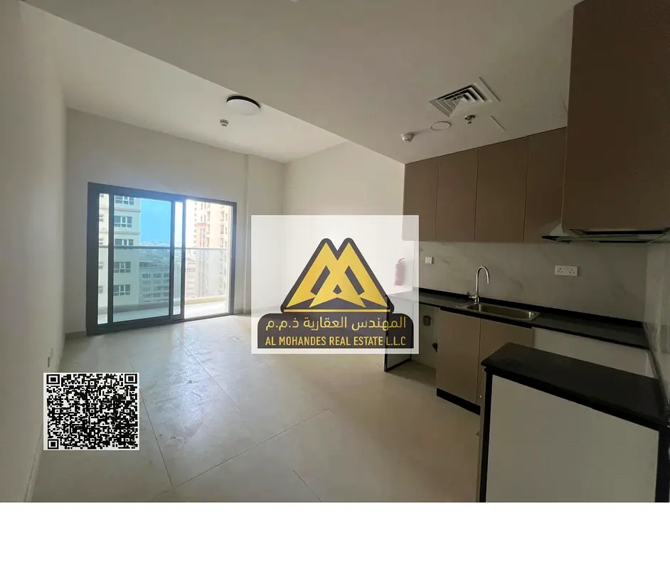 Luxury studio for annual rent in Residence Towers, Al Amerah, Ajman. Spacious with balcony and open view, practical kitchen. Rent AED 26,000 yearly, 4