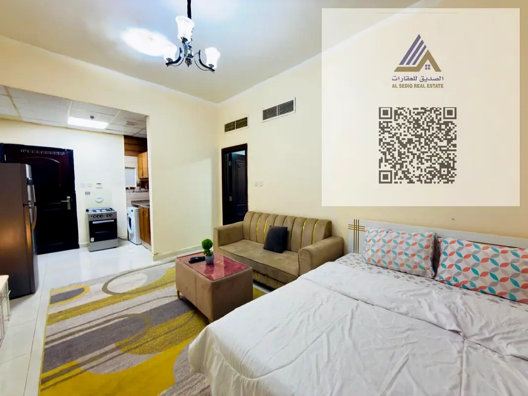 (No commission) Furnished studio apartment for monthly rent in Al Rawda area, Ajman. Separate kitchen, brand new furniture.