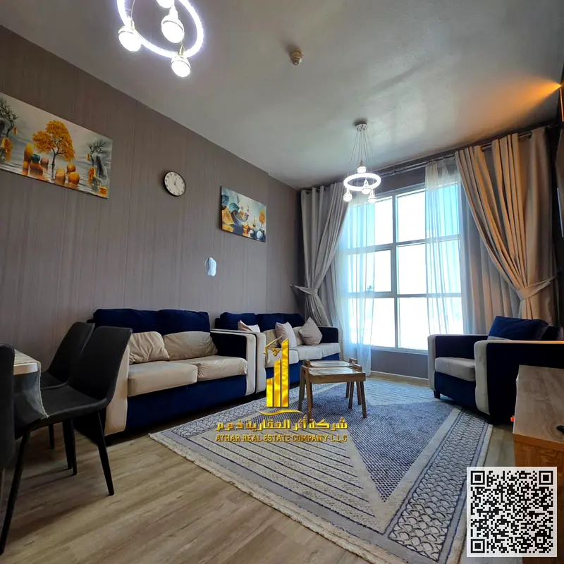 Luxury one-bedroom apartment with a balcony in Ajman City Tower. Fully furnished, available for monthly rent. ✨ Rent includes utilities, internet, and parking.