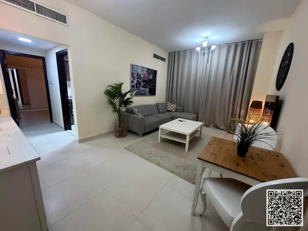 Luxury one-bedroom apartment with a living room and balcony offering an open view. Ajman, Al Hamidiya. Fully furnished for monthly rent. ✨ Rent includes utilities, internet, and parking.