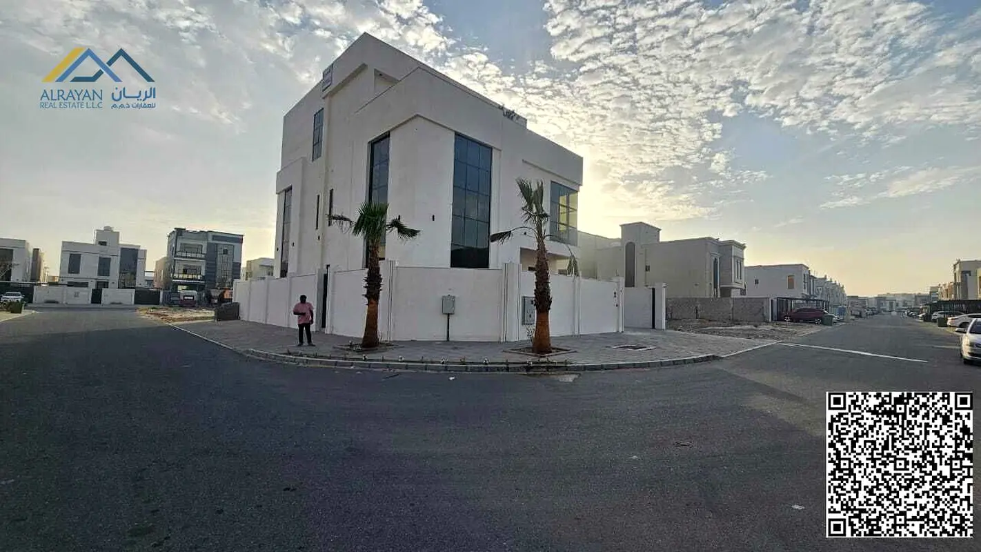 Classic corner villa in Al Helio 2 (excellent location), Ajman, on a prime street. It boasts a good setback in front and a large setback on the other side for parking. The villa features high-end finishes with the latest decor. It includes a large majlis (formal sitting room), a spacious living room, a kitchen, a master bedroom, and a maid's room. The first floor has four bedrooms, a large living room, and a kitchenette. The second floor has a master bedroom. The villa has a total of six bedrooms. It is pre-wired for central air conditioning. The property includes a swimming pool, a yard, a water fountain on the roof, landscaping, and a laundry room. The price is AED 2,750,000 excluding registration fees, or AED 2,850,000 including registration fees.