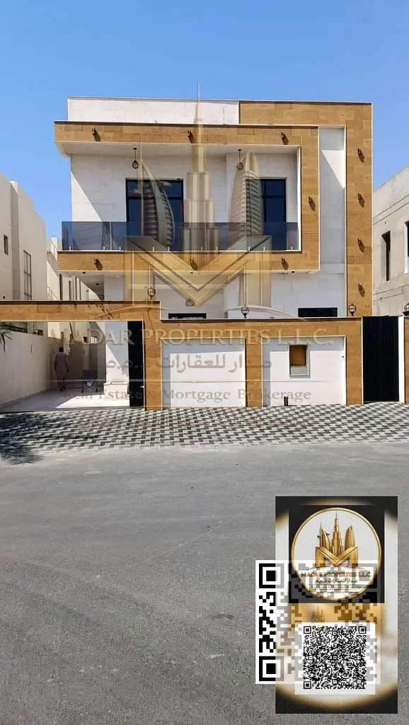 This modern two-story villa offers a spacious and well-designed layout. The ground floor features two living areas (a small majlis and a large majlis with a private bathroom), a master bedroom with built-in wardrobes, and a large kitchen.